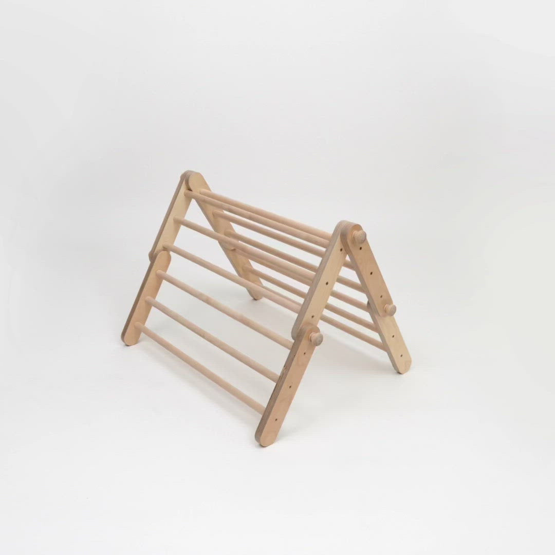 Das Kletterrahmen kann durch Enttäuschung der Griffe mit der Gewindestange zerlegt werden. Auf diese Weise können Sie es in Abschnitte unterteilen, die leicht unter einem Bett/hinter einem Schrank und an ähnlichen Stellen aufbewahrt werden können.