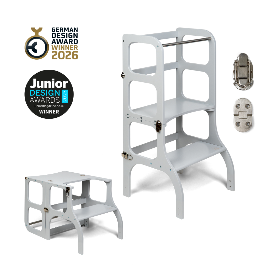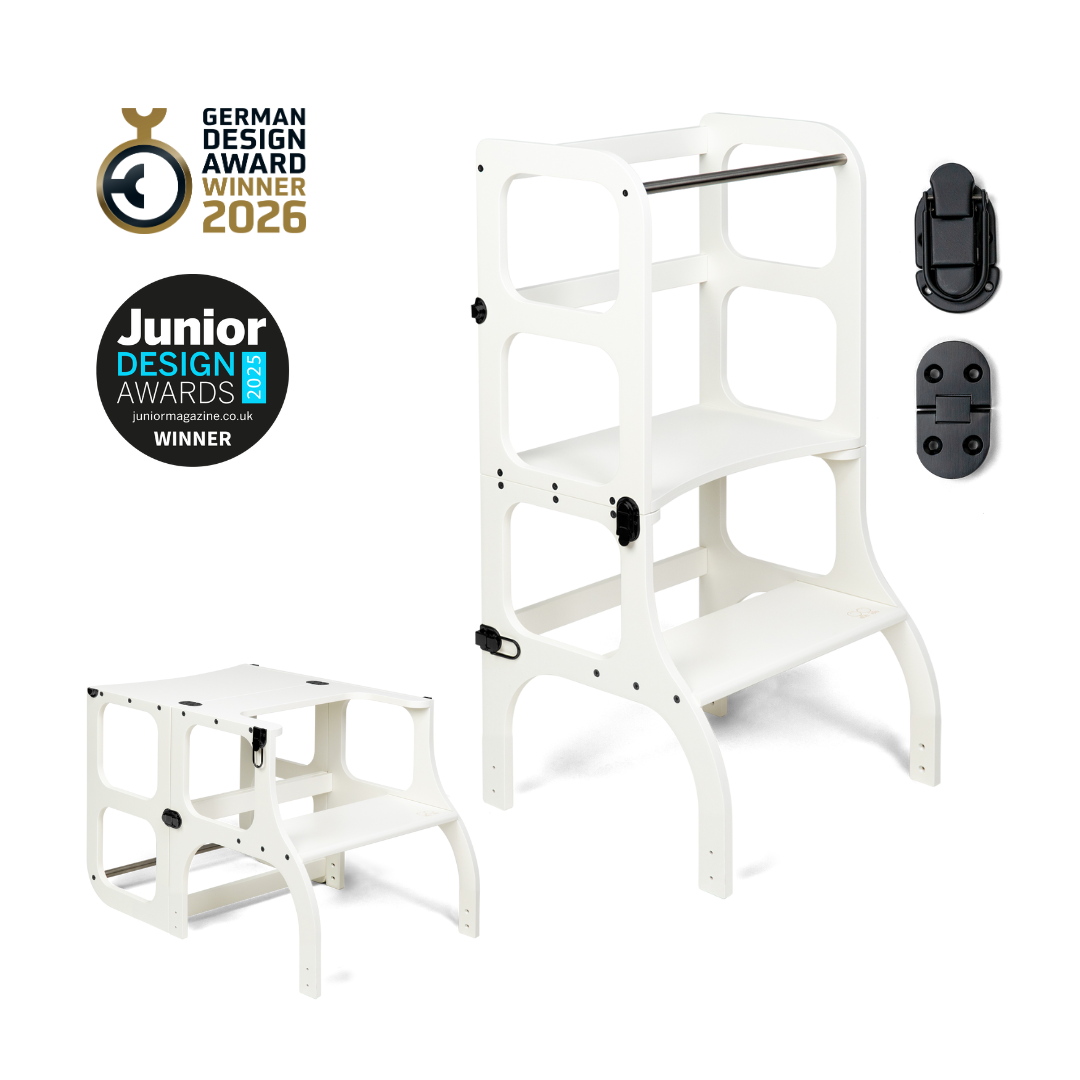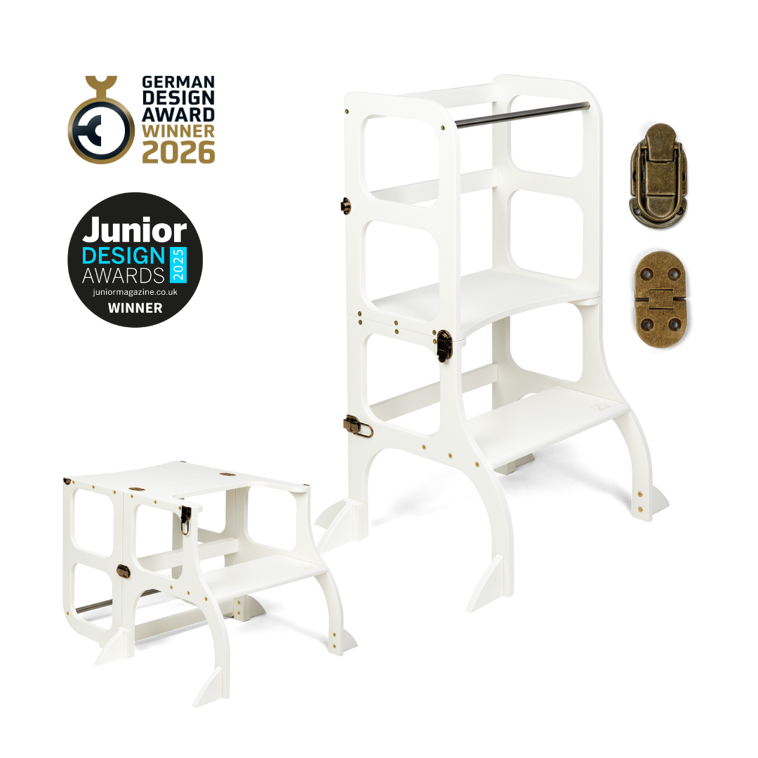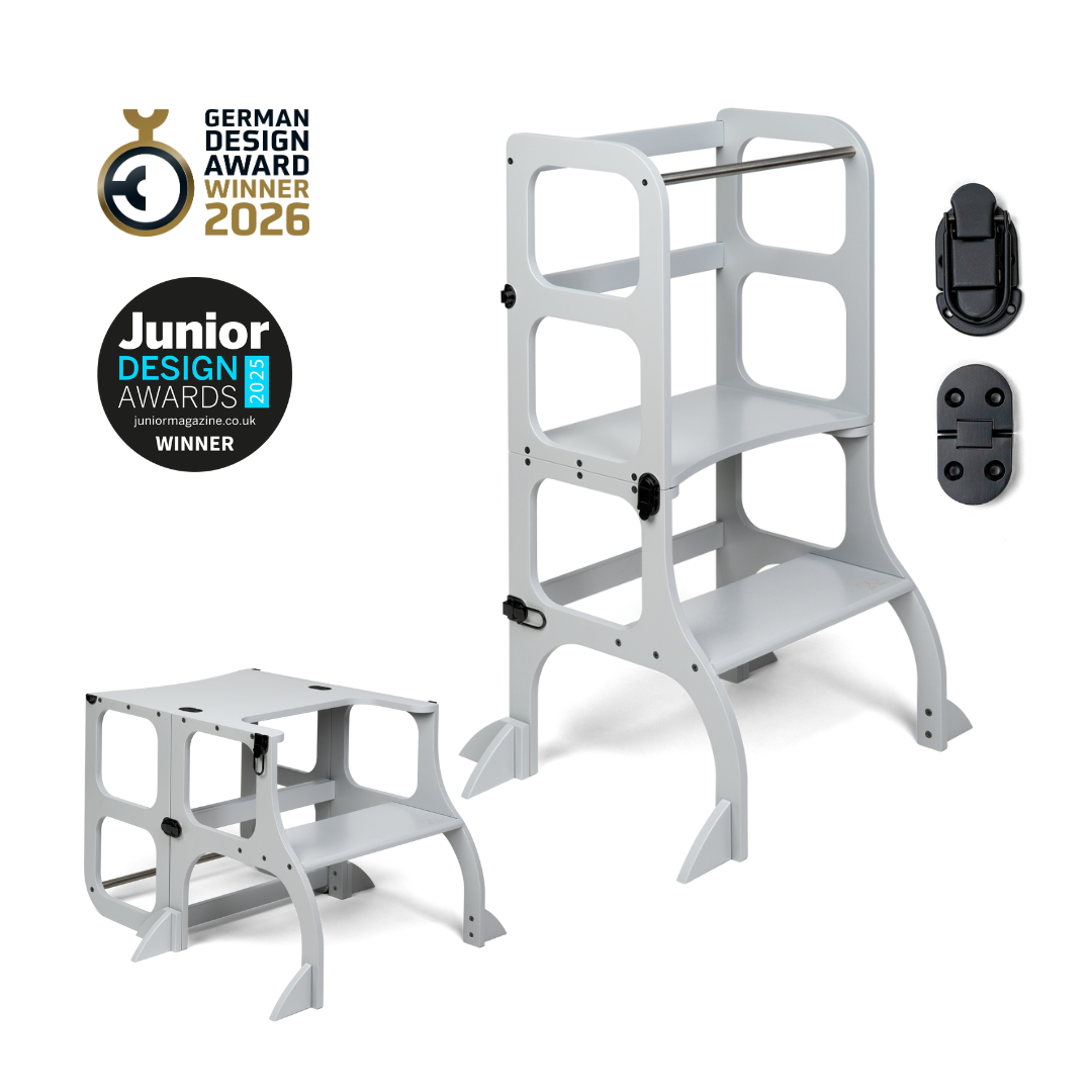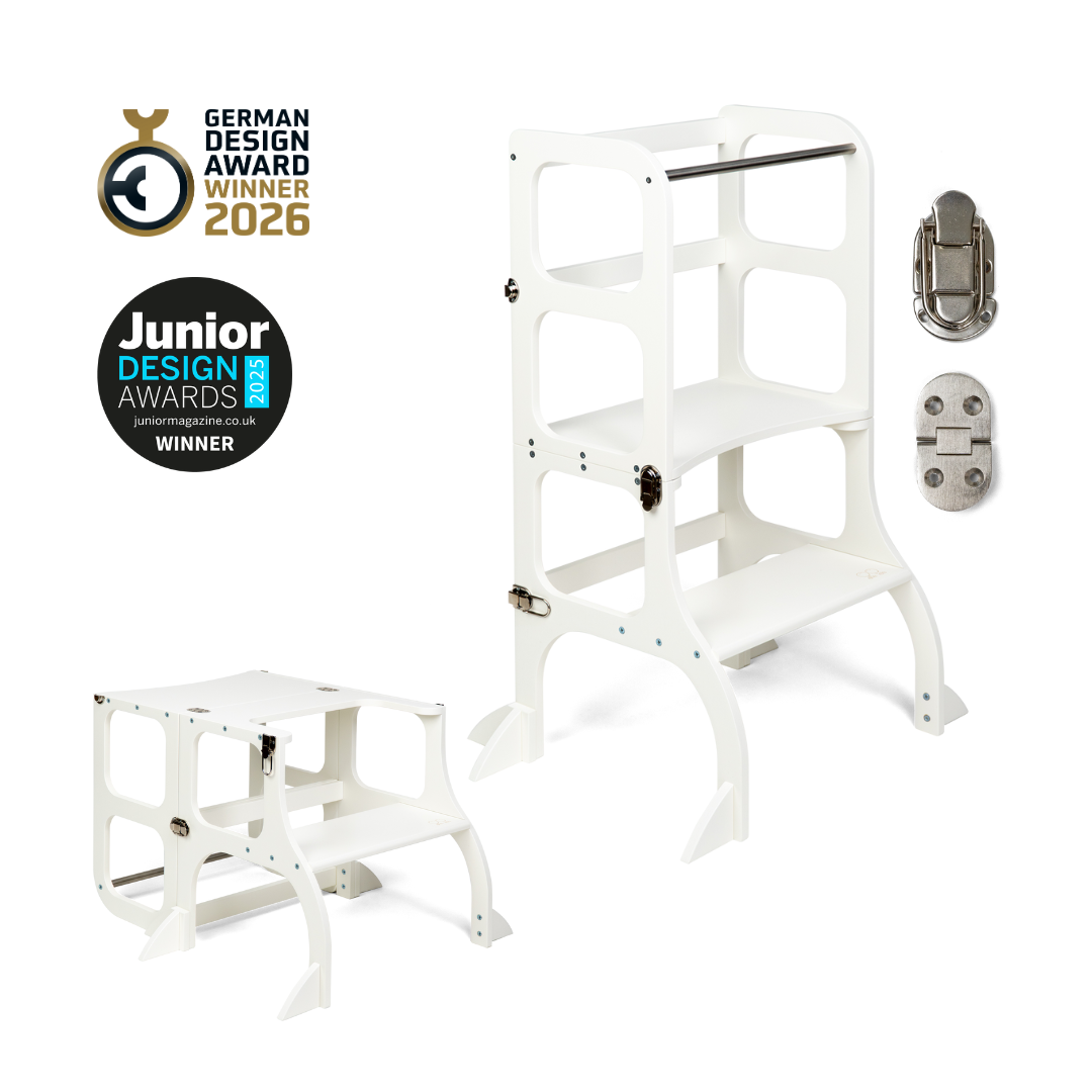 El diseño de la torre de ayuda se basa en el principio básico de la pedagogía Montessori para desarrollar la independencia y la participación de un niño en las tareas cotidianas. La torre de ayuda convertible no ocupa mucho espacio y combina dos piezas necesarias de muebles para niños en uno.