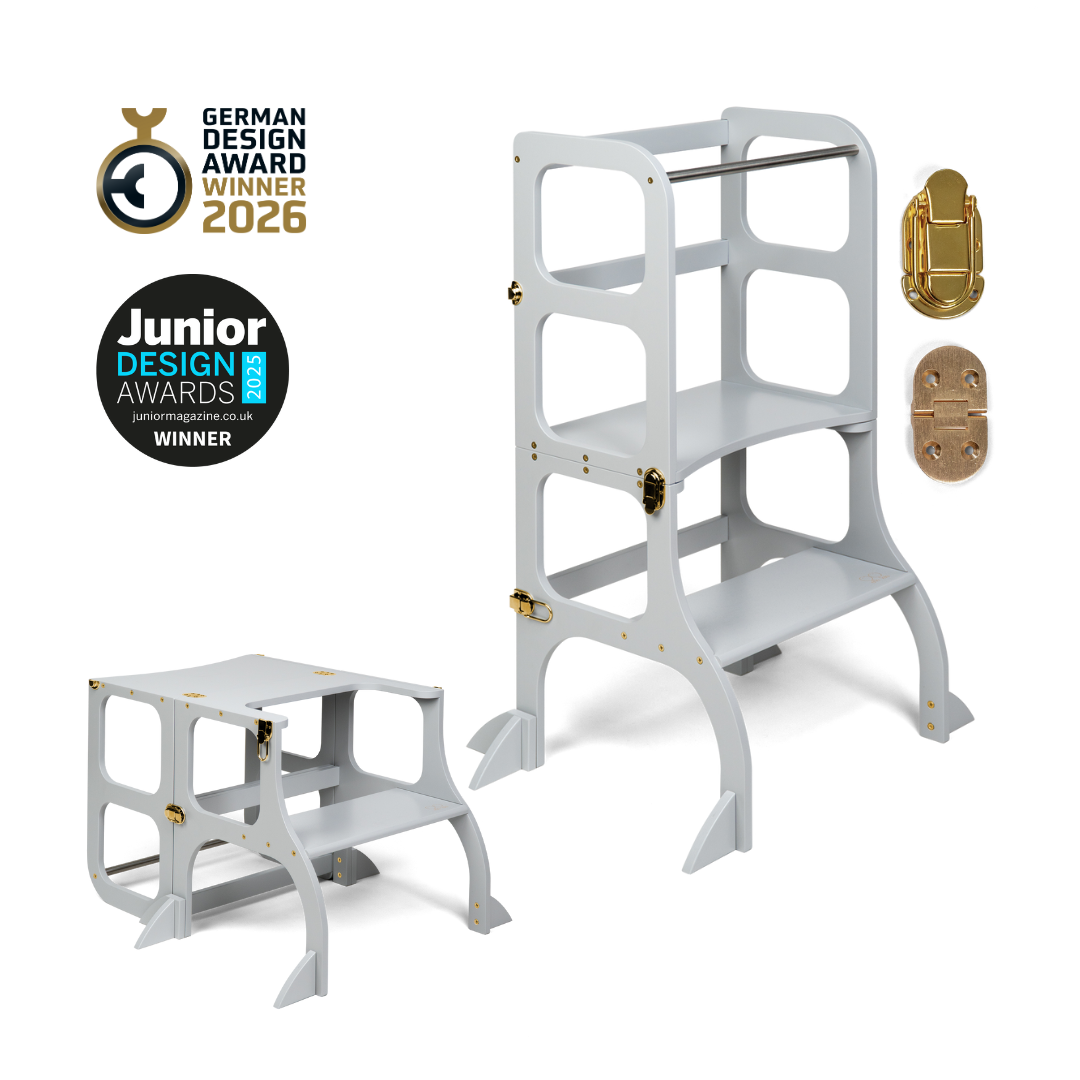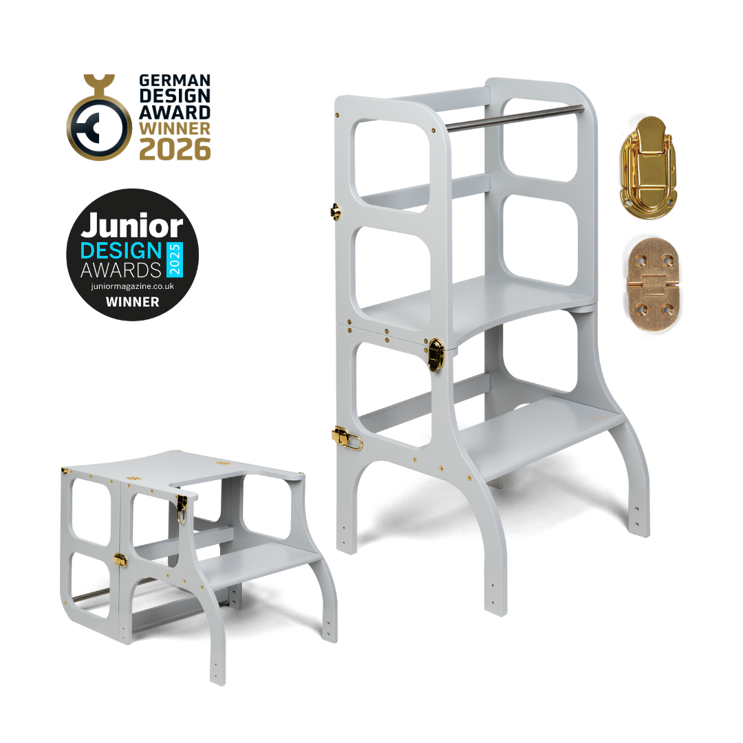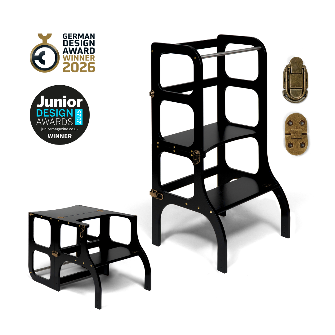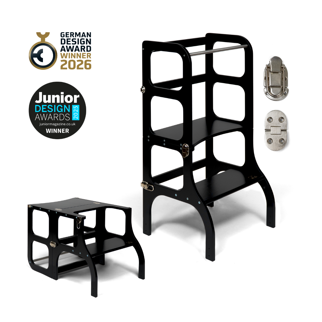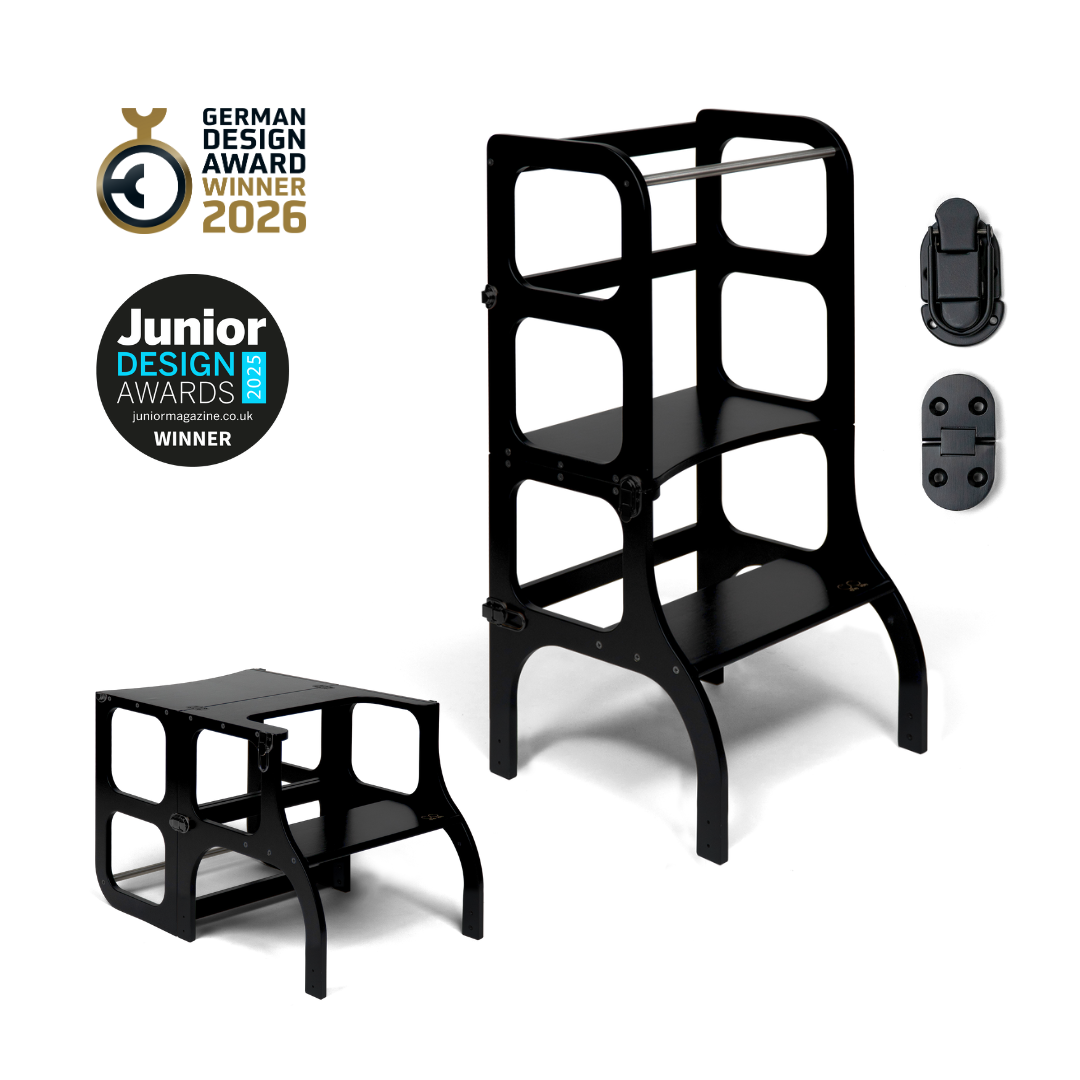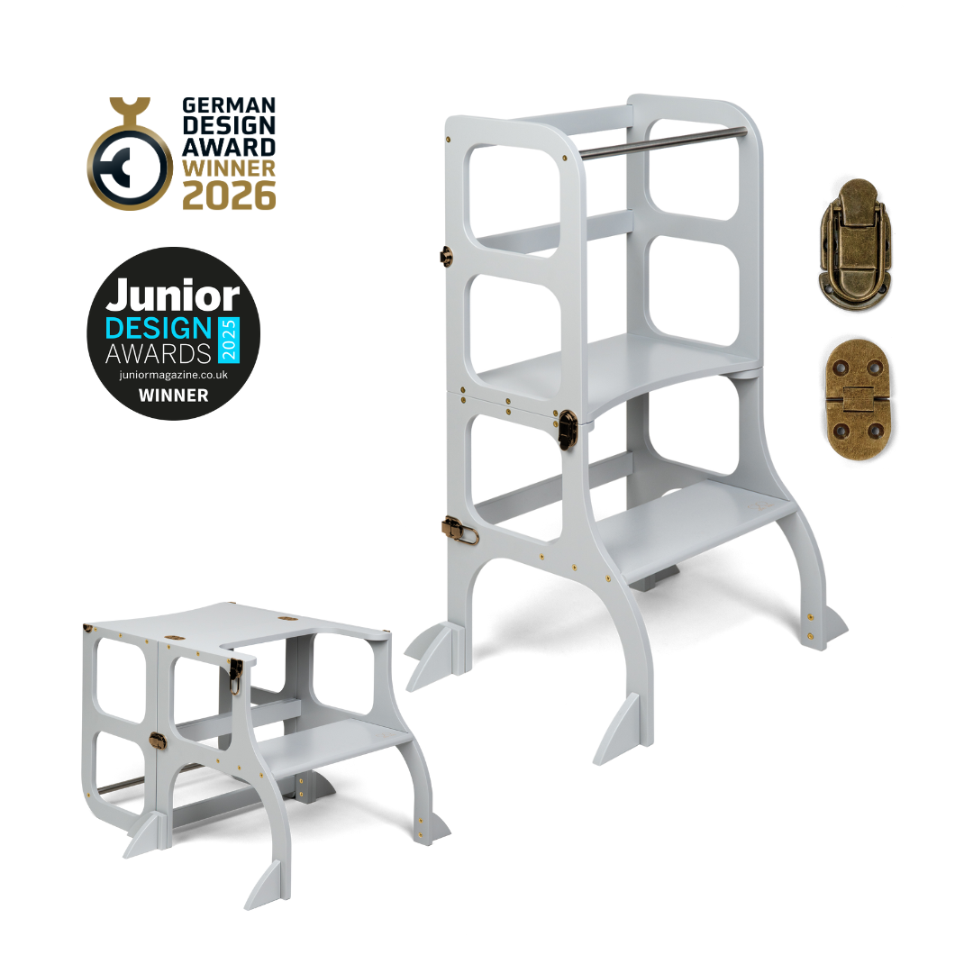 El diseño de la torre de ayuda se basa en el principio básico de la pedagogía Montessori para desarrollar la independencia y la participación de un niño en las tareas cotidianas. La torre de ayuda convertible no ocupa mucho espacio y combina dos piezas necesarias de muebles para niños en uno.