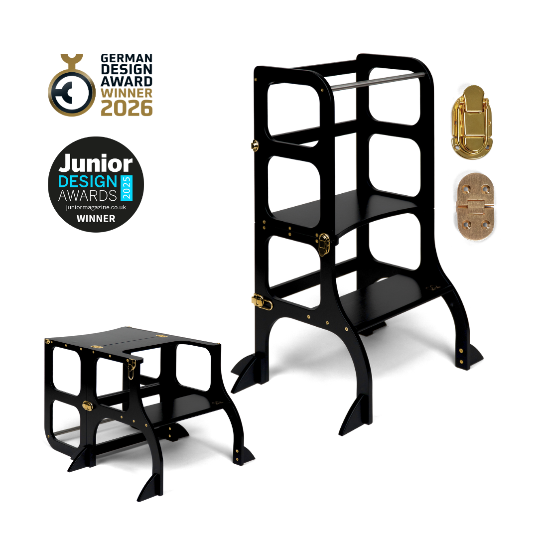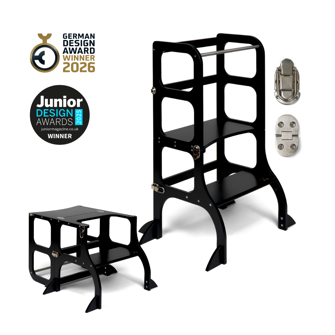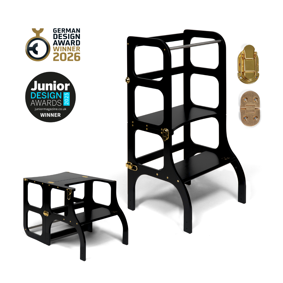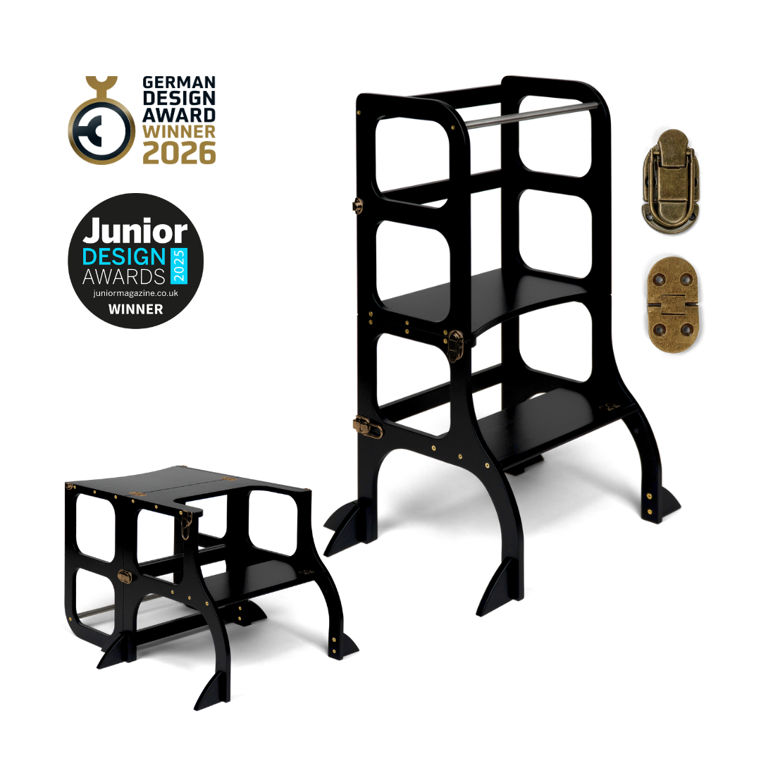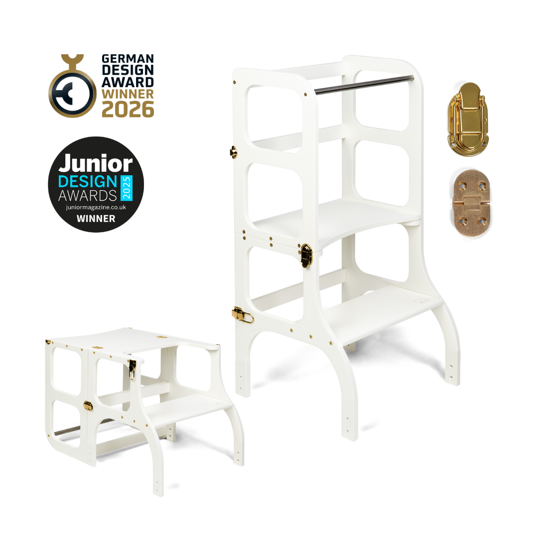 El diseño de la torre de ayuda se basa en el principio básico de la pedagogía Montessori para desarrollar la independencia y la participación de un niño en las tareas cotidianas. La torre de ayuda convertible no ocupa mucho espacio y combina dos piezas necesarias de muebles para niños en uno.