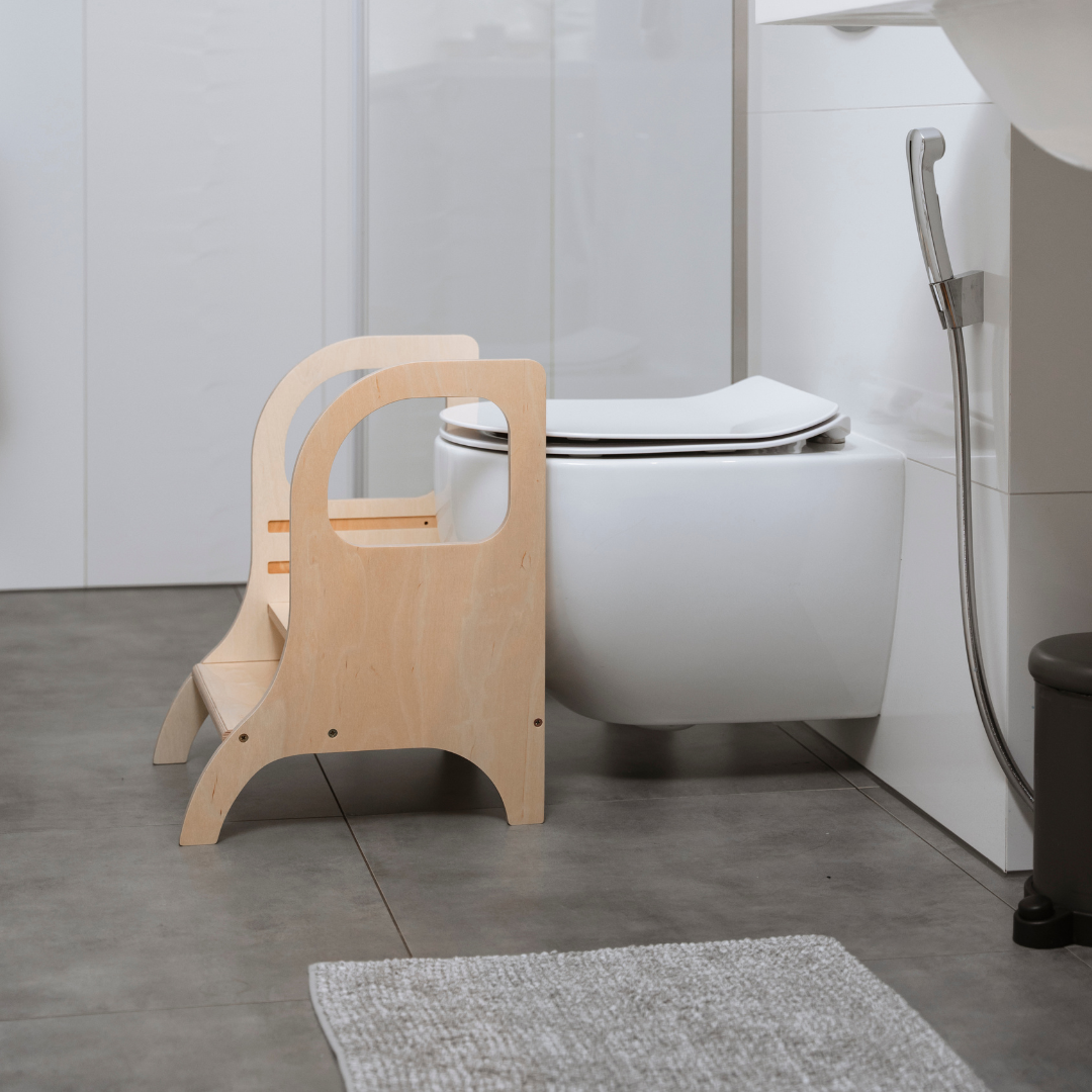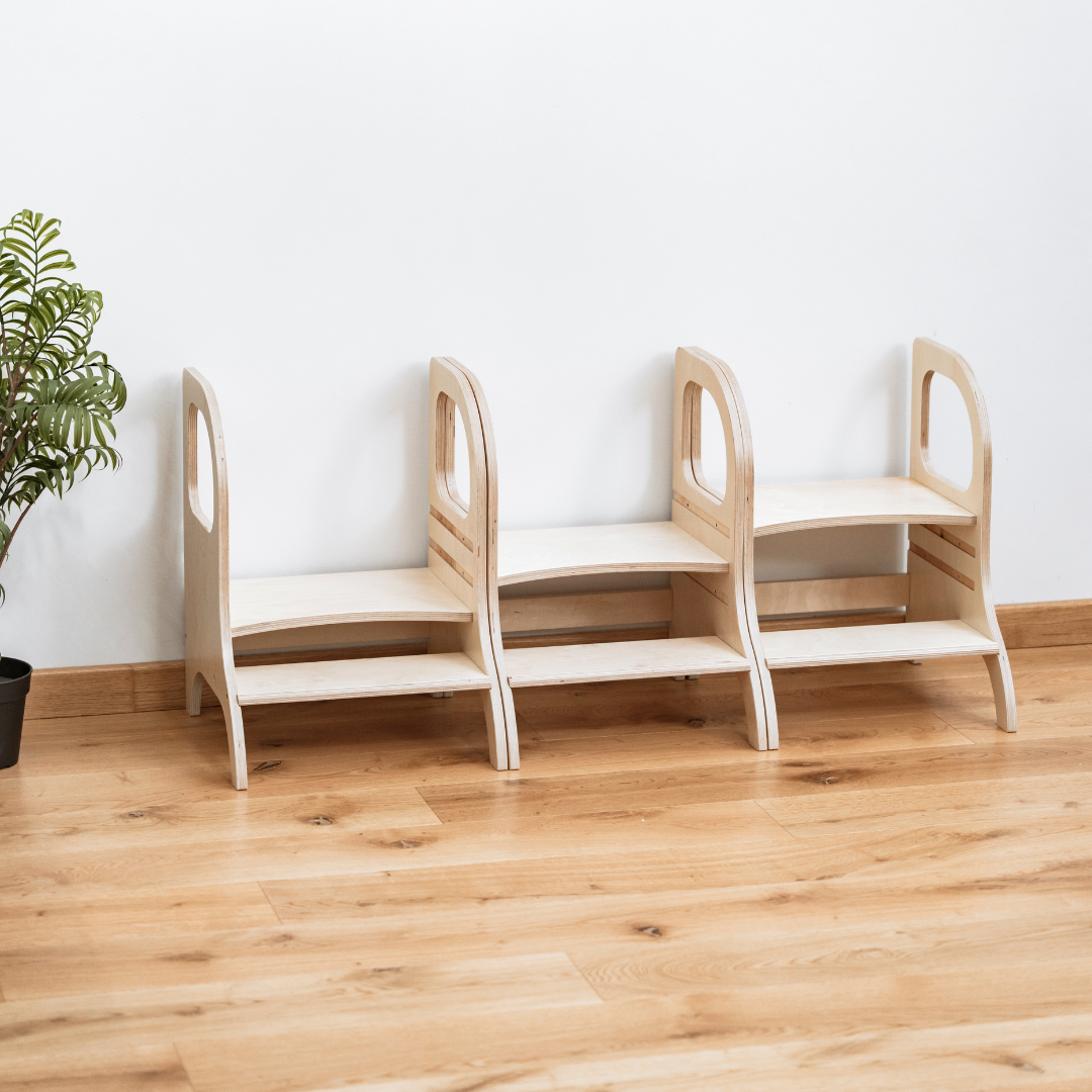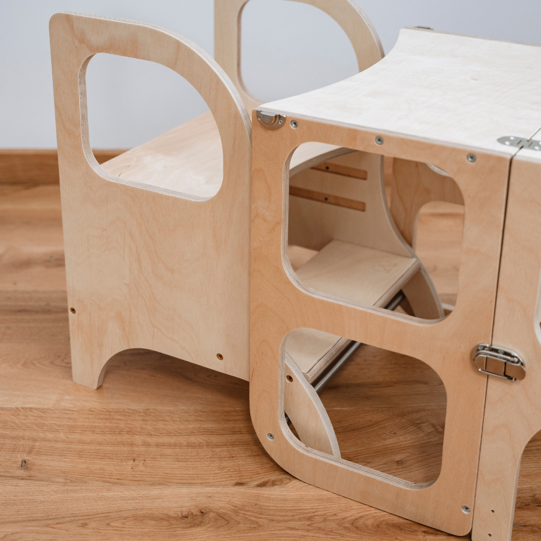 The design of the helper tower is based on the basic principle of Montessori pedagogy for developing a child’s independence and involvement in everyday tasks. The convertible helper tower does not take up a lot of space and combines two necessary pieces of children’s furniture into one.